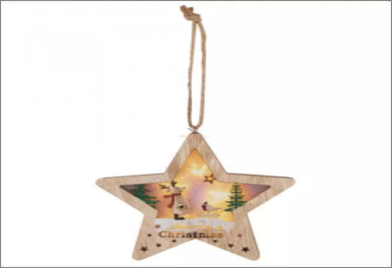 Beltéri fa ajtó-ablakdísz csillag meleg fehér színben. 6 LED fényforrással. Tápellátás: 2 x 1 V (AAA) elem.