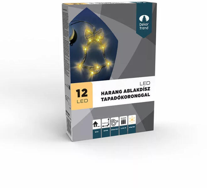 Ez az elegáns harang ablakdísz ideális választás ablakok, asztalok vagy polcok ünnepi dekorálásához. A meleg fehér fényt adó 12 LED-es világítás meghitt hangulatot teremt. A termék tapadókorongjának köszönhetően egyszerűen felhelyezhető, és három darab elemmel működik, külön összeszerelést nem igényel az elemek beszerzésén kívül. Mérete: 16 x 20 cm. Tápellátás: elemIp védettség: beltéri IP20Teljesítmény: 0,048 WLED típus: energiatakarékos LED izzókKábelszín: ezüst színű kábelFelhasználás: beltériToldható: nemMagasság: 16 cm