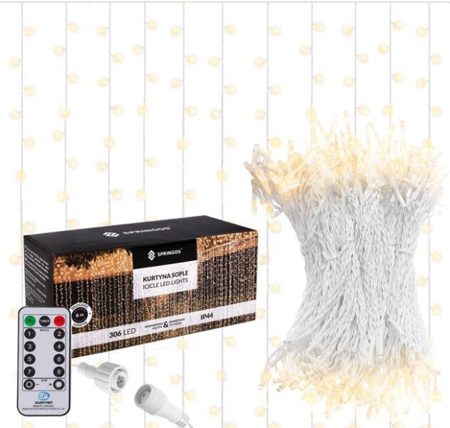 SPRINGOS Távirányítós Fényfüggöny - 306 LED Csillagfüzér, Meleg Fehér